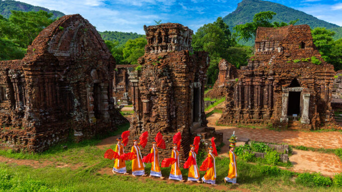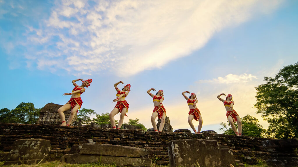 - Thưởng thức biểu diễn nghệ thuật Chăm: Bạn có thể ngồi giữa thung lũng tháp và xem múa Apsara, múa dâng lễ, múa đội nước, cùng nghe tiếng trống Paranưng và kèn Saranai ngân vang. Không gian linh thiêng của Mỹ Sơn khiến mọi động tác múa và giai điệu thêm phần trang trọng, như đưa du khách trở về miền quá khứ Champa huyền diệu.