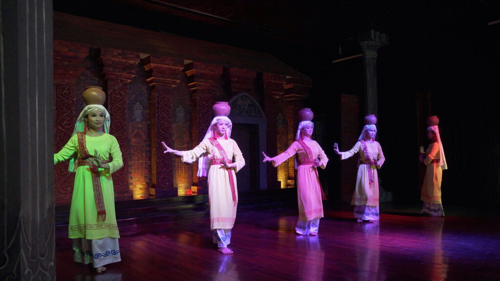 Múa Apsara là một trong những điệu múa biểu trưng nhất. Vũ công Apsara tái hiện hình tượng mỹ nữ điêu khắc trên đá, uyển chuyển trong trang phục gấm vóc. Ngoài ra, múa dâng lễ của các cô gái Chăm – đội lễ vật (trái cây, nước, bình gốm) lên đầu – thể hiện sự tôn kính thần linh trong lễ Katê, Rija. Các tiết mục múa đội nước và múa quạt truyền thống cũng góp phần làm phong phú chương trình. Tất cả các màn trình diễn được tổ chức ngay giữa thung lũng Mỹ Sơn, khiến khung cảnh tháp cổ càng thêm linh thiêng và cuốn hút.